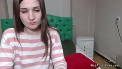 Hot brunette amateur babe from Ukraine AmfisaBert laying still in bed fully clothed in jeans pants then stripping off naked and posing in her solo live webcam show