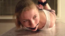 Wearing nothing but a sheer lace lingerie set, Angel's curves are highlighted as she is tightly bound in thick ropes in the kitchen. Her body tenses and her eyes grow wide with arousal as she feels every tug of the rope against her skin, exploring the holy trinity of pain, pleasure, and submission.