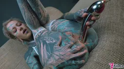 Happy to receive a new stainless-steel dildo from a fan, Anuskatzz is going to stick it inside both of her tattooed holes!
