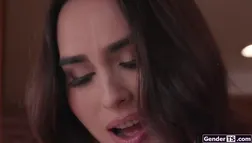 Asian tgirl babysitter Ember Fiera is all wet and seduces her boss.The busty shemale gets her big boobs sucked and has her small tranny dick sucked.On her knees the brunette trans is deeptroat facefucked before she bareback anal rides his big cock