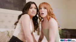 Brunette comes home to her cheating redhead wife and has sex.The petite asian whos hiding in the closet masturbates on them and squirts out an orgasm.She caught but the small tits babe thinks a threesome will boost their marriage and they all lick