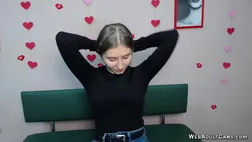 Beautiful blonde Ukrainian amateur babe in jeans pants and tight black blouse flashing her belly and red panties in front of her webcam on solo live private homemade show
