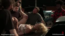 Blonde slave Dylan Ryan with hands bound in box tie gets dragged in auto body shop by master Tommy Pistol then anal fingered and fucked for public