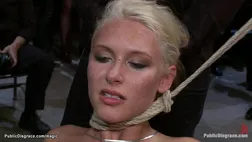 Bound blonde babe on knees Katie Summers with back arched gets sensed then pussy fucked by big cock James Deen and Mr Pete in public crowded place set by Princess Donna Dolore