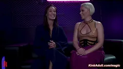 Blonde MILF dominatrix in latex Helena Locke makes submissive Asian lesbian slave Christy Love worship her bare feet then in a suspension spanks her and crops her pussy and feet