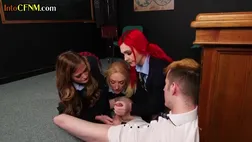 British femdom students wank off teacher in his office during this kinky and erotic domination session