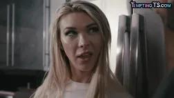 Busty trans big boobed blonde MILF in sexy red lingerie bangs BFs asshole in various sex positions on the bed until his cumshot