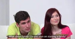 Female sexy tanned agent welcomed couple on fake interview for job She made them to fuck on couch then she joined them in threesome and made dude to fuck her