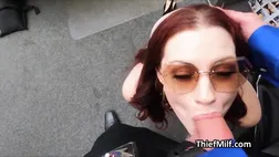 She is soooo slutty. This hot redhead milf got busted for stealing some pills and now its time to pay for them.. with her juicy pussy and filthy mouth!