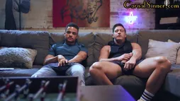 Gay stud duo with inked muscled bodies enjoy rimming and barebacking passionate sex on the couch in various sex positions