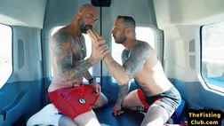 Gaydaddy with gloves fisting BFs ass in outdoor public van