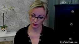 Description: Blonde German amateur MILF LUXvanessa with the glasses in a orange mini skirt and black blouse with a big cleavage flashes breasts on solo private webcam show homemade by:  patrisquar