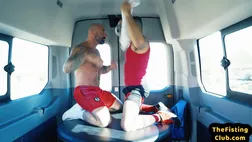 Hairy bottom fisted and fucked by tattooed gaydaddy in van