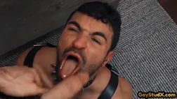Hairy deepthroating bottom in leather harness bareback banged in closeup POV video with cumshot on his gaped hairy asshole