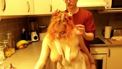Hefty Emo Bra-Stuffers Juggling In Kitchen