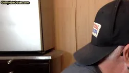 Homemade gloryhole DILF sucks BFs rod through gloryhole