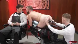Barbers Logan Bell and Devin Franco is waiting for some customer until Brian comes in wanting for some shave so Logan starts shaving Devins beard and down he strips Devin and starts lubing his hands to give Nathan one good fisting until they cums
