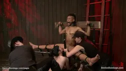 Ebony Nikki Darling and brunette Katharine Cane are bound and mounted with all weight on pussy on board by lezdoms Mz Berlin and Claire Adams on device bondage
