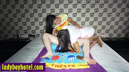 Lucky guy fucked two horny shemales Phatida and sexy Asian ladyboy Aemy after they gave him a blowjob Sexy tranny swallowed big dildo White guy fucked shemale while ladyboy licking his ass After ass licking tranny enjoyed anal