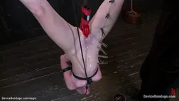 Pallid ball-gagged loser Marie McCray in crimson pantyhose in strappado torture restrain bondage gets twat vibrated then in upside down suspension jammed with sextoy by tormentor Orlando on tool restrain bondage