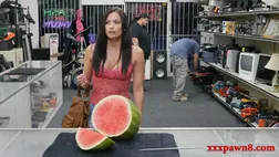 Perky titted amateur brunette babe sucks off and gets her shaved pussy pounded by nasty pawn keeper in his office