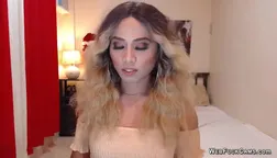 Super hot blonde amateur shemale TSQueenofPLEASURE strips off in front of webcam then masturbates in chair until cums in hand for her fans on solo show