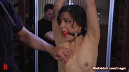 The session starts with Juliette March bound and gagged while John Strong flogs her and James Mogul plays with her boobs then throat fucked until takes breath control with a mask