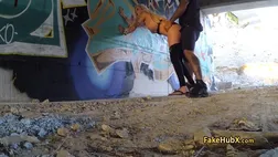 Blonde slim slut with tattoos all over body flashed tits to police officer in uniform then gave him blowjob outdoors and ended deep fucked and jizzed