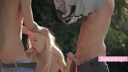 Small blondie is about to have bang-out with 2 dudes at the same time, in her ample garden
