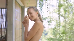 Superb looking teenager with killer, blue eyes, Katya Clover is posing nude on the balcony