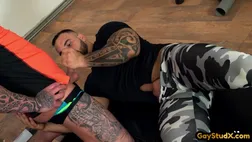 Tattooed nympho hunk fucked by nice stud in anal holre