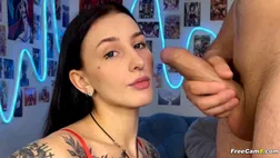 This brunette woman with inked body on her knees to sucks and swallows big cock. The way her tongue flicks and dances around his throbbing dick is pure art, each movement calculates and designed to bring him closer and closer to the edge of pleasure. Her petite body is the perfect for his eager hands and mouth, her moans of pleasure spurring him on. She loves that big member of his and wanted to have some naughty and horny fun. She continues stroking that humongous tool with ease and pleasure.