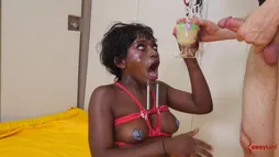 Petite throat fucked ebony sub is bound and tied for BDSM and foot worship