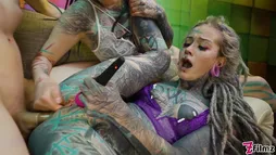 Anuskatzz and her also heavily tattooed friend Iluz get hard fucked by Illuz's boyfriend, Paracoz.