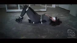 Uber-Sexy dark-haired in a cock-squeezing, black catsuit got roped up, cock-squeezing and left on the floor